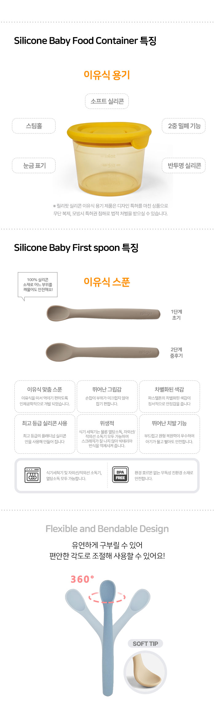 | 취급방법 및 취급시 주의사항, 안전표시 | • 처음 사용시 깨끗하게 세척해 주세요. • 보호자 감독하에 사용해 주세요. • 세척시 거친 브러쉬나 수세미 사용은 피해 주세요. • 화기에 주의해 주세요. • 설거지시 날카로운 소재에 마찰 될 경우 표면에 상처가 날 수 있으니 주의해 주세요. • 음식물이 오래 묻어 있을 경우 물들 수 있으니 바로 세척해 주세요. |