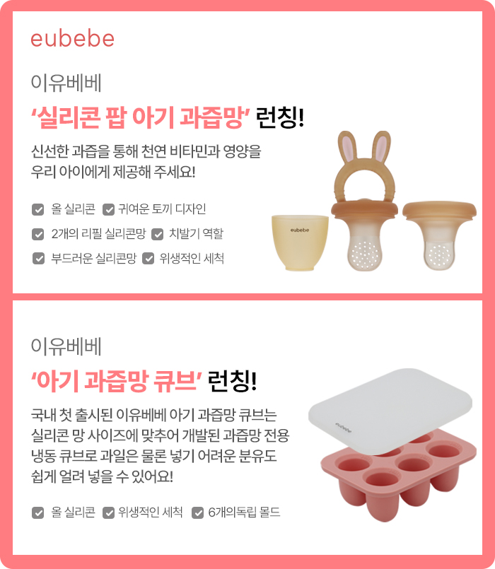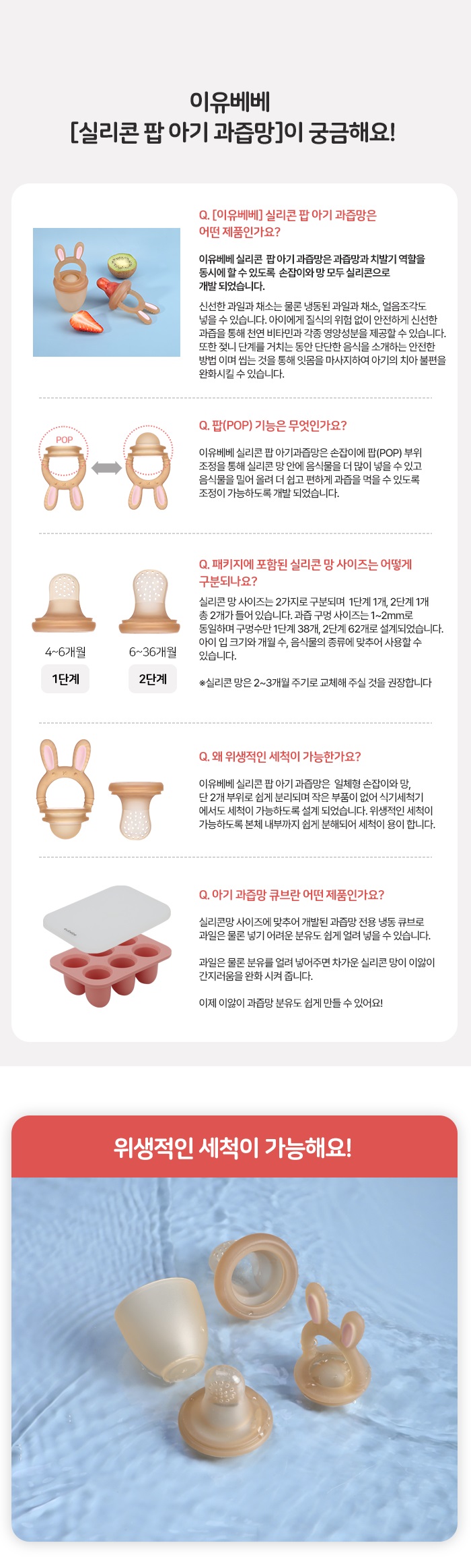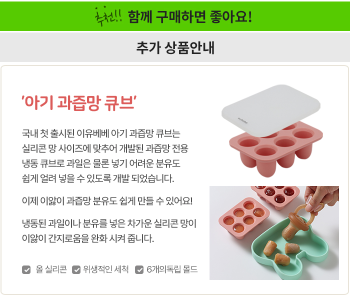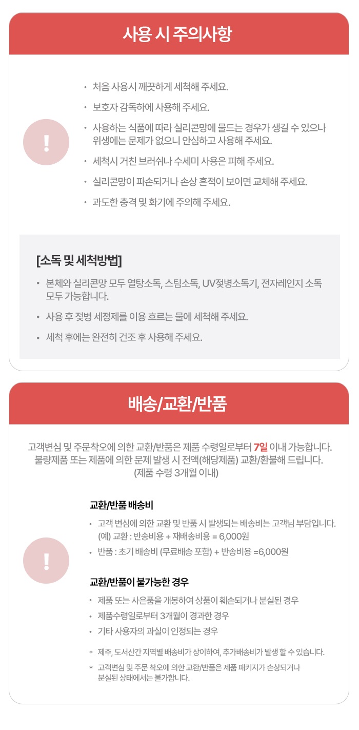 | 취급방법 및 취급시 주의사항, 안전표시 | • 처음 사용시 깨끗하게 세척해 주세요. • 반드시 보호자 감독하에 사용해 주세요. • 사용하는 식품에 따라 실리콘망에 물드는 경우가 생길 수 있으나 위생에는 문제가 없으니 안심하고 사용해 주세요. • 세척시 거친 브러쉬나 수세미 사용은 피해 주세요. • 실리콘망이 파손되거나 손상 흔적이 보이면 교체해 주세요. • 과도한 충격 및 화기에 주의해 주세요. [소독 및 세척방법] • 본체와 실리콘망 모두 열탕소독, 스팀소독, UV젖병소독기, 전자레인지 소독 모두 가능합니다. • 사용 후 젖병 세정제를 이용 흐르는 물에 세척해 주세요. • 세척 후에는 완전히 건조 후 사용해 주세요. |