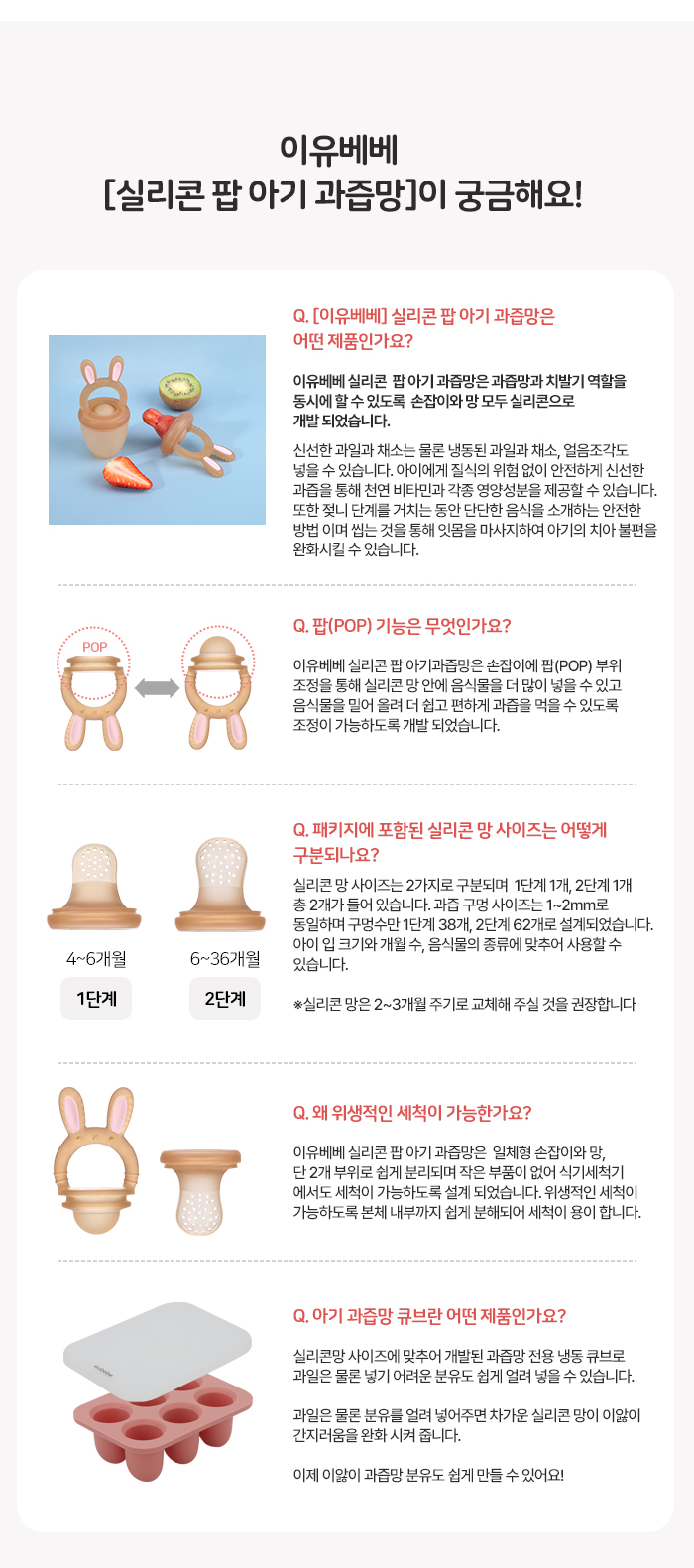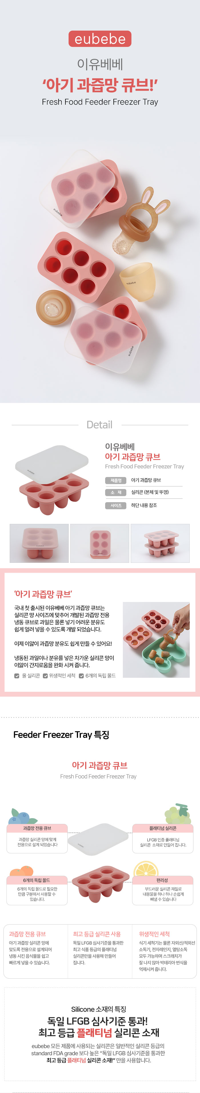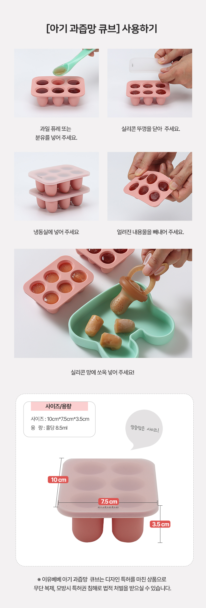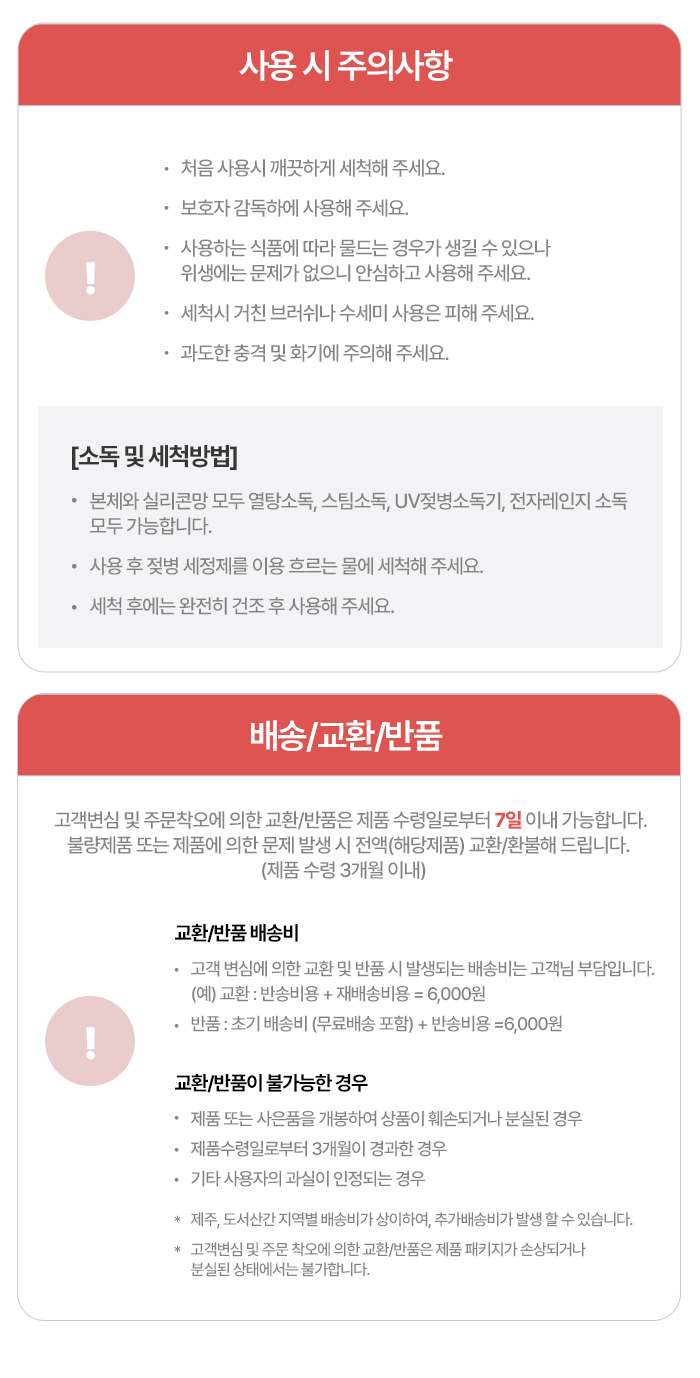 | 취급방법 및 취급시 주의사항, 안전표시 | • 처음 사용시 깨끗하게 세척해 주세요. • 반드시 보호자 감독하에 사용해 주세요. • 사용하는 식품에 따라 실리콘 큐브에 물드는 경우가 생길 수 있으나 위생에는 문제가 없으니 안심하고 사용해 주세요. • 세척시 거친 브러쉬나 수세미 사용은 피해 주세요. • 과도한 충격 및 화기에 주의해 주세요. [소독 및 세척방법] • 본체와 실리콘망, 큐브 모두 열탕소독, 스팀소독, UV젖병소독기, 전자레인지 소독 모두 가능합니다. • 사용 후 젖병 세정제를 이용 흐르는 물에 세척해 주세요. • 세척 후에는 완전히 건조 후 사용해 주세요. |